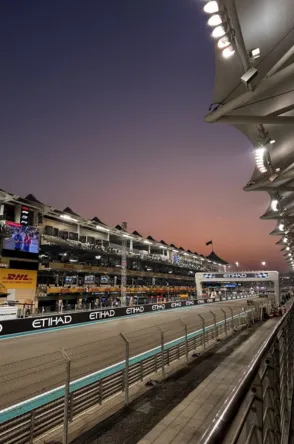 The race is held at the Yas Marina Circuit. This is a modern, purpose-built Formula One circuit located on Yas Island. The track features smooth asphalt, a mix of slow and medium-speed corners, and long straights. The race starts in daylight and finishes under floodlights, creating a smooth transition from day to night.